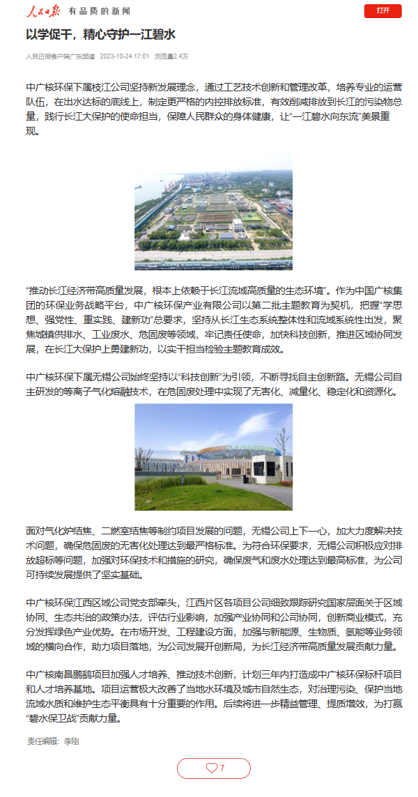 10月24日,人民日报发布报道《以学促干,精心守护一江碧水》,深入讲述中广核环保产业有限����� �������Ƴ������������ �������Ƴ������������ �������Ƴ������������ �������Ƴ�������公司践行长江大保护的使命担当,����� �������Ƴ������������ �������Ƴ������������ �������Ƴ������������ �������Ƴ�������保障人民群众身体健康,坚持从从长江生态系统整体性和流域系统性出发,聚焦城镇供排水、工业废水、危固废等领域,加快科技创新,推进区域协同发展,在长江大保护上勇建新功,以实干担当检验主题教育成效。����� �������Ƴ������������ �������Ƴ������������ �������Ƴ������������ �������Ƴ�������