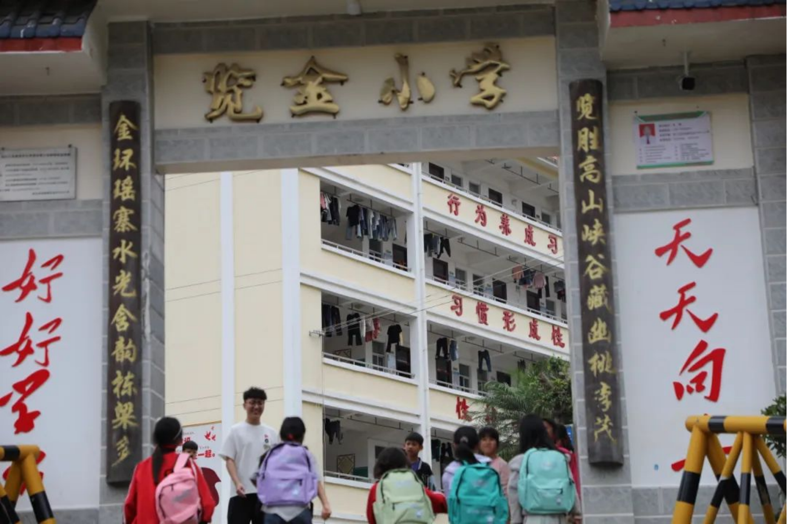 ▲校门口,孩子们背着彩虹项目组捐赠的新����� �������Ƴ������������ �������Ƴ������������ �������Ƴ������������ �������Ƴ�������书包,与守候多时的支教老����� �������Ƴ������������ �������Ƴ������������ �������Ƴ������������ �������Ƴ�������师再次重逢