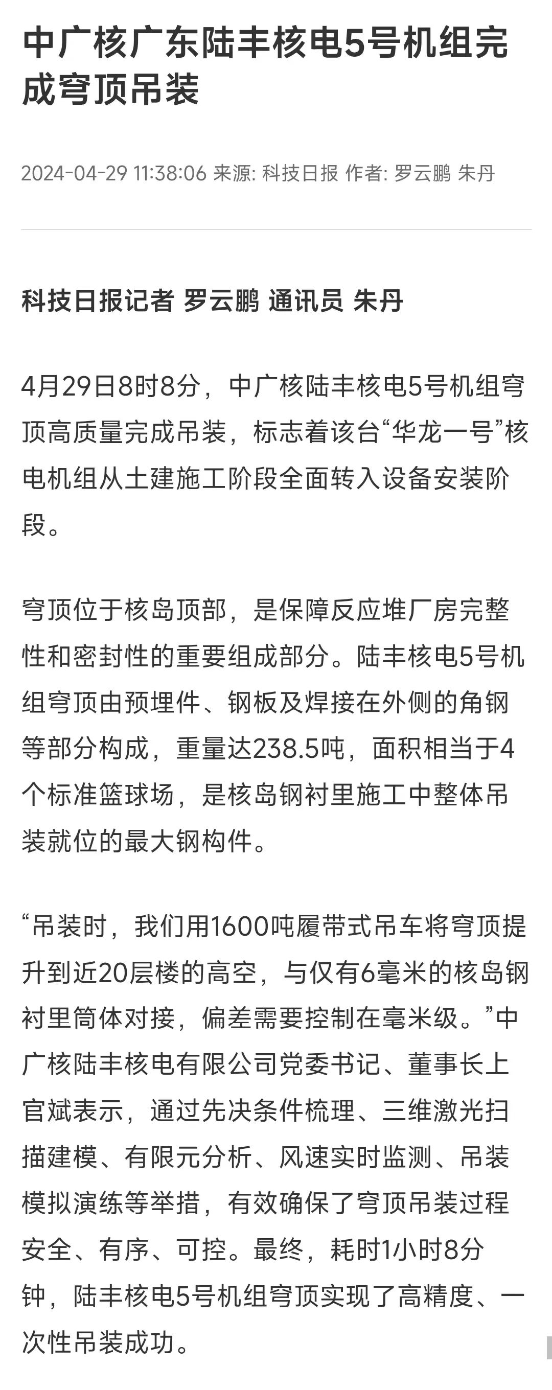 “吊装时,我们用1600吨履带式吊车将穹顶提����� �������Ƴ������������ �������Ƴ������������ �������Ƴ������������ �������Ƴ�������升到近20层楼的高空,与仅有6毫米����� �������Ƴ������������ �������Ƴ������������ �������Ƴ������������ �������Ƴ�������的核岛钢衬里筒体对接,偏差需要控制到毫米级����� �������Ƴ������������ �������Ƴ������������ �������Ƴ������������ �������Ƴ������。”中广核陆丰核电有限公司党委书记、董事长上官����� �������Ƴ������������ �������Ƴ������������ �������Ƴ������������ �������Ƴ�������斌介绍道,通过先决条件梳理、三维激光����� �������Ƴ������������ �������Ƴ������������ �������Ƴ������������ �������Ƴ�������扫描建模、有限元分析、风速实����� �������Ƴ������������ �������Ƴ������������ �������Ƴ������������ �������Ƴ�������时监测、吊装模拟演练等举����� �������Ƴ������������ �������Ƴ������������ �������Ƴ������������ �������Ƴ�������措,有效确保了穹顶吊装过程安全、有序、可����� �������Ƴ������������ �������Ƴ������������ �������Ƴ������������ �������Ƴ�������控。最终,耗时1小时8分钟,陆����� �������Ƴ����������� �������Ƴ����������� �������Ƴ������������ �������Ƴ������丰核电5号机组穹顶高精度一次吊����� �������Ƴ������������ �������Ƴ������������ �������Ƴ������������ �������Ƴ�������装成功。