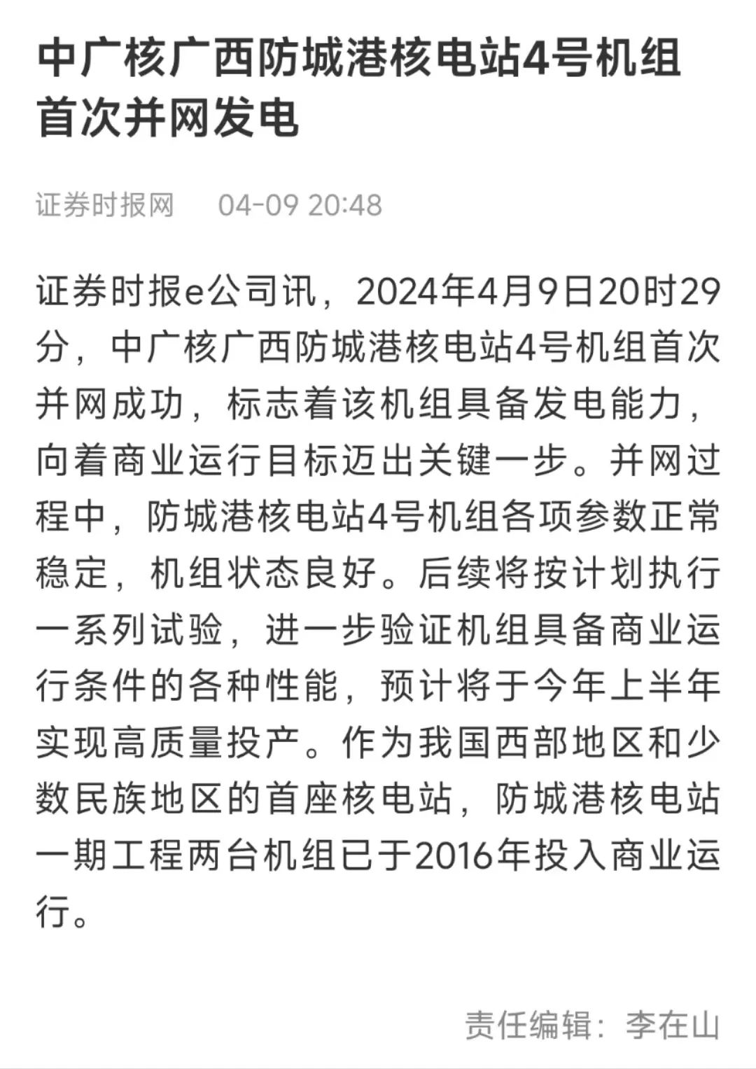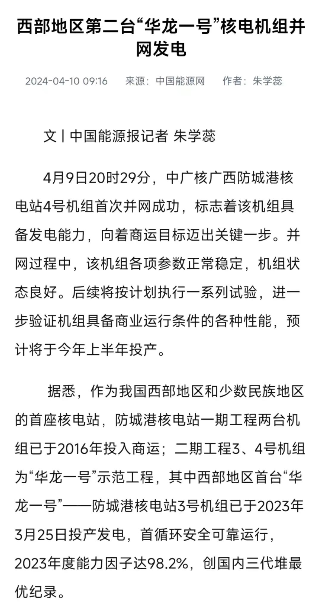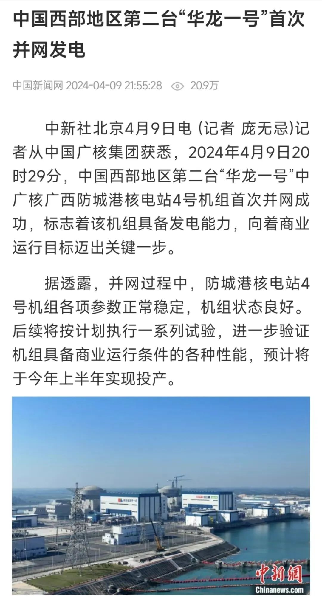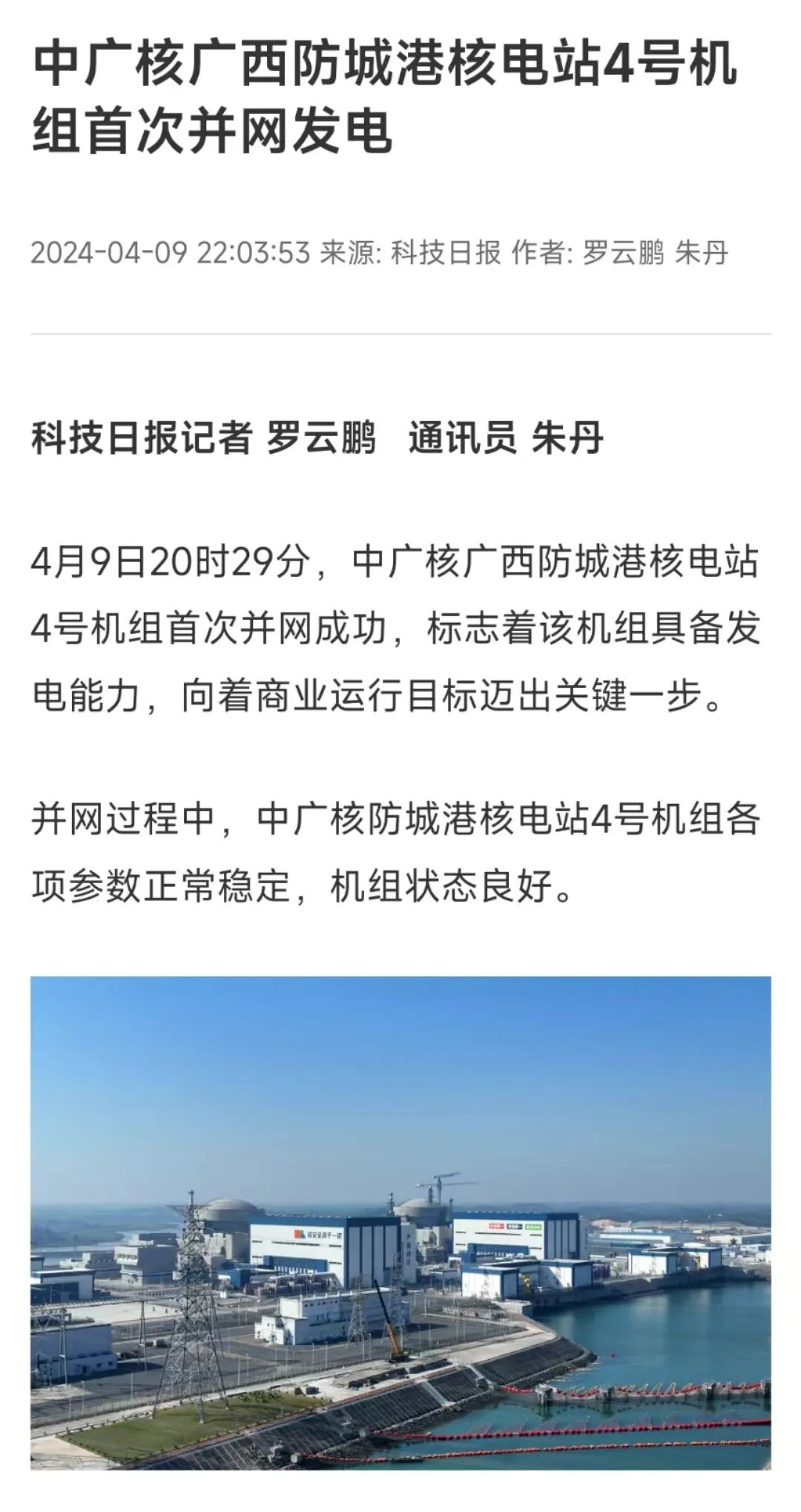 4月9日20时29分,中广核广西����� �������Ƴ����������� �������Ƴ����������� �������Ƴ������������ �������Ƴ�������防城港核电站4号机组首次并网成功,标志着����� �������Ƴ����������� �������Ƴ������������ �������Ƴ������������ �������Ƴ�������该机组具备发电能力,向着商业运����� �������Ƴ������������ �������Ƴ������������ �������Ƴ������������ �������Ƴ�������行目标又迈出了关键一步。
