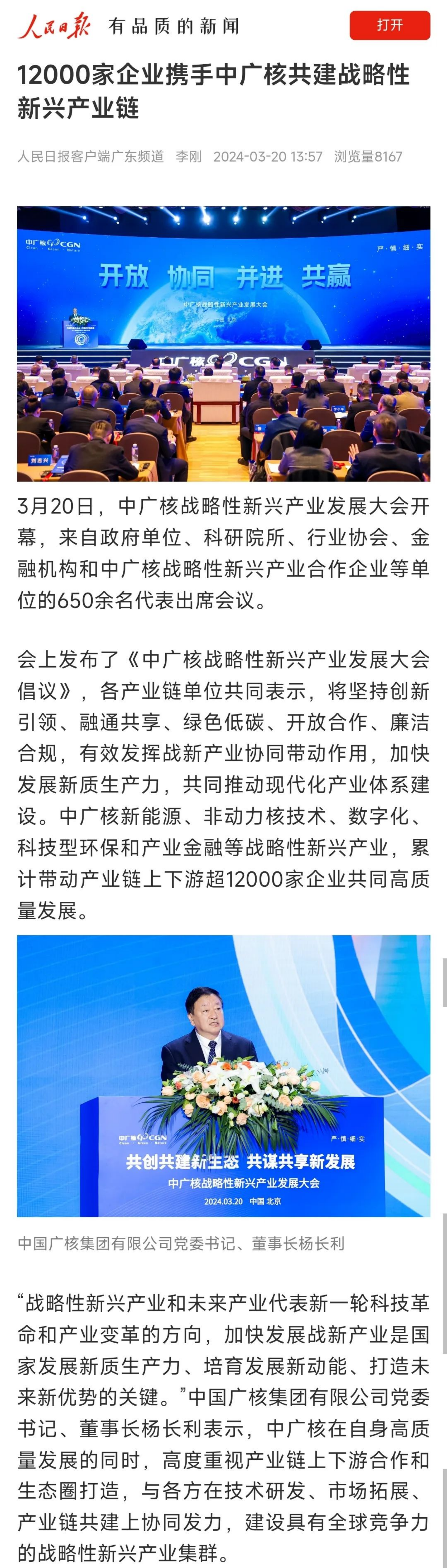 “战略性新兴产业和未来产业代表新一轮科技革命和����� �������Ƴ������������ �������Ƴ������������ �������Ƴ������������ �������Ƴ������产业变革的方向,加快发展战新产业是国����� �������Ƴ������������ �������Ƴ������������ �������Ƴ������������ �������Ƴ�������家发展新质生产力、培育发展新动能、打造未来新优����� �������Ƴ����������� �������Ƴ������������ �������Ƴ������������ �������Ƴ�������势的关键。”中国广核集团有限公司党委书记、董����� �������Ƴ����������� �������Ƴ������������ �������Ƴ������������ �������Ƴ������事长杨长利表示,中广核在自身高质量发展的同时,����� �������Ƴ������������ �������Ƴ������������ �������Ƴ������������ �������Ƴ�������高度重视产业链上下游合作和生态圈打造,����� �������Ƴ������������ �������Ƴ����������� �������Ƴ������������ �������Ƴ������与各方在技术研发、市场拓展、产业����� �������Ƴ������������ �������Ƴ������������ �������Ƴ������������ �������Ƴ�������链共建上协同发力,建设具有全球����� �������Ƴ������������ �������Ƴ������������ �������Ƴ������������ �������Ƴ������竞争力的战略性新兴产业集群。